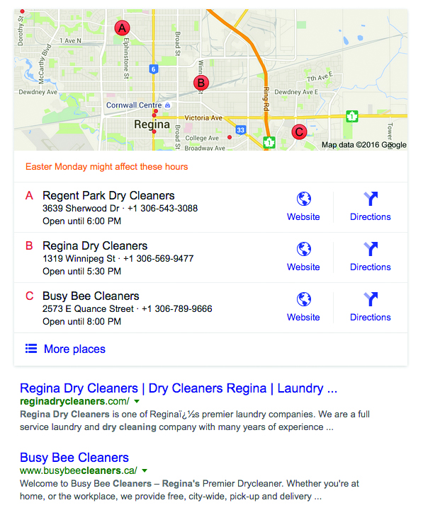 Notice that there are ‘more places’ that can be displayed? When you click on more places, you will see more dry cleaners in Regina. Why did those businesses not get included in Google’s search results? Well, they aren’t listed in Google’s My Business system, or in Google Maps, so Google cannot display them as these businesses are not as relevant to the search terms as dictated by Google’s proprietary information ranking system, so they are reduced in ranking score and not displayed. All these other cleaners are missing out on potential business simply because they are not listed, and not being found, which costs sales and lost income. Learn from my local cleaner’s mistakes, BE included!