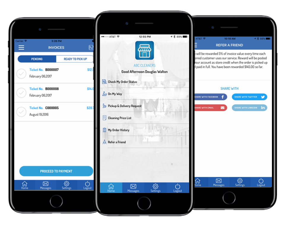 iDryclean Pro enables your customers to connect to your store anytime providing them with an array of functionality and services. With iDryclean Pro your customers can Track their orders (with full ticket recall), Track their order history; Receive Push Notifications of specials and promotions; Make payments and Schedule a Pickup or Delivery (integrates with Touch Control software). Customers can let you know they’re coming to pick up orders with the unique ‘On My Way’ feature. If that were not enough, now your customer can refer their Facebook friends, Twitter followers and LinkedIn connections to your business and be rewarded for it. The App can be branded with your name and logo.