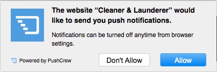 Click on the ‘Get Notifications’ button, and a new window will pop up. Accept the subscription to the Cleaner and Launderer feed, and that’s it. Now, whenever the Cleaner and Launderer has new, relevant content that applies to your dry cleaning business or the dry cleaning industry as a whole, you will get a pop up notification on your desktop, tablet, or smartphone, just like the screen shot of one of the pushed notifications like this one below.