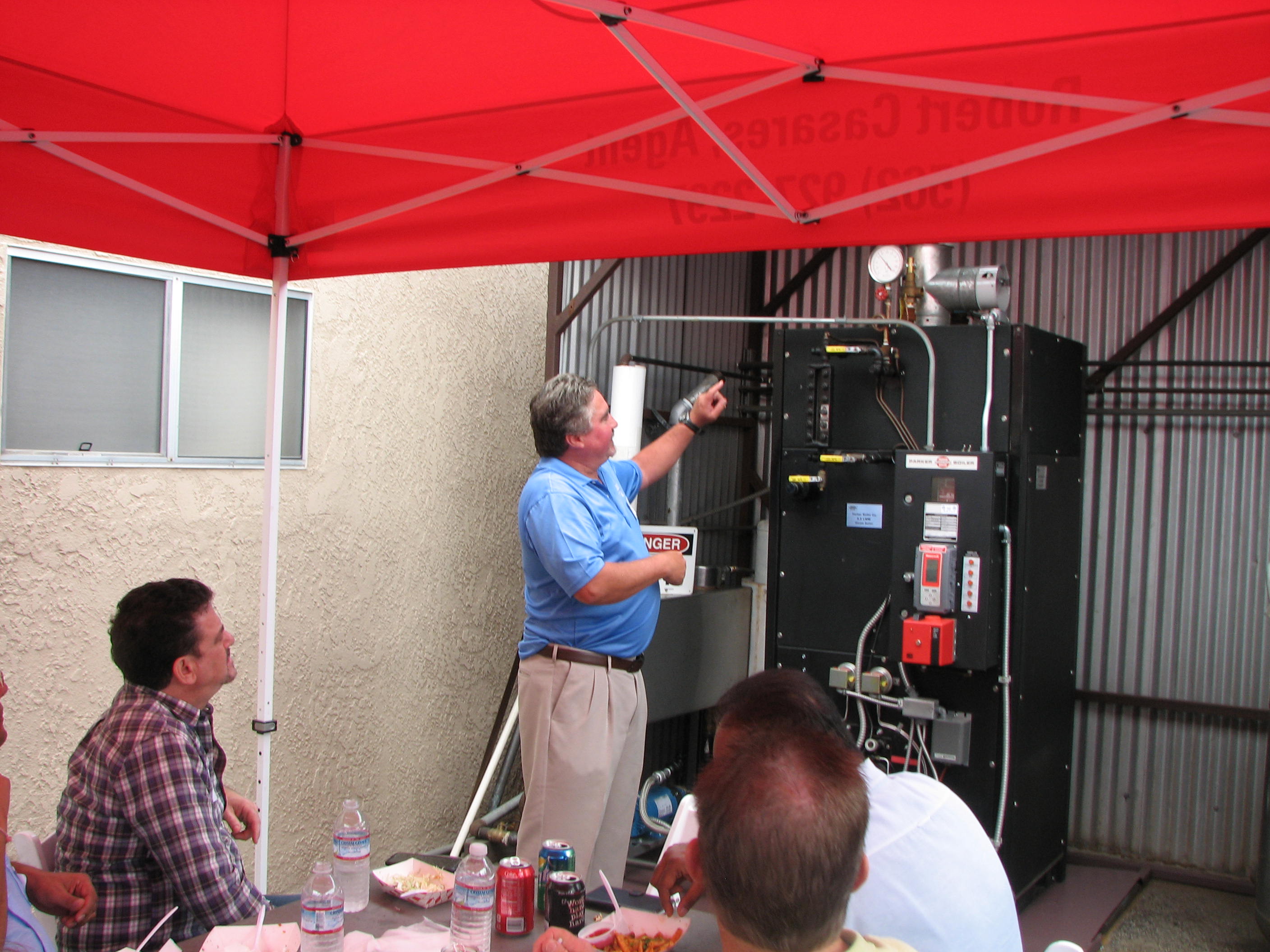 Mike Leming introduced the newest Parker Boiler Vertical 100 Series. The boiler comes in 10, 15, 20 and 23 HP gas fired and is 7% more efficient than your standard boiler. It has 6” instead of 10”vent and only needs 12” rear clearance and can go through a 35” door. It has heavy duty boiler tubes built for long-term service life. There is less heat loss due to water wall sealed combustion chamber design.